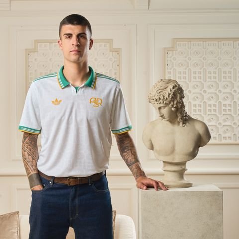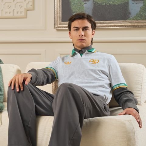 Этот комплект разработан компанией Adidas и выполнен в белом цвете с зелеными и оранжевыми акцентами.
