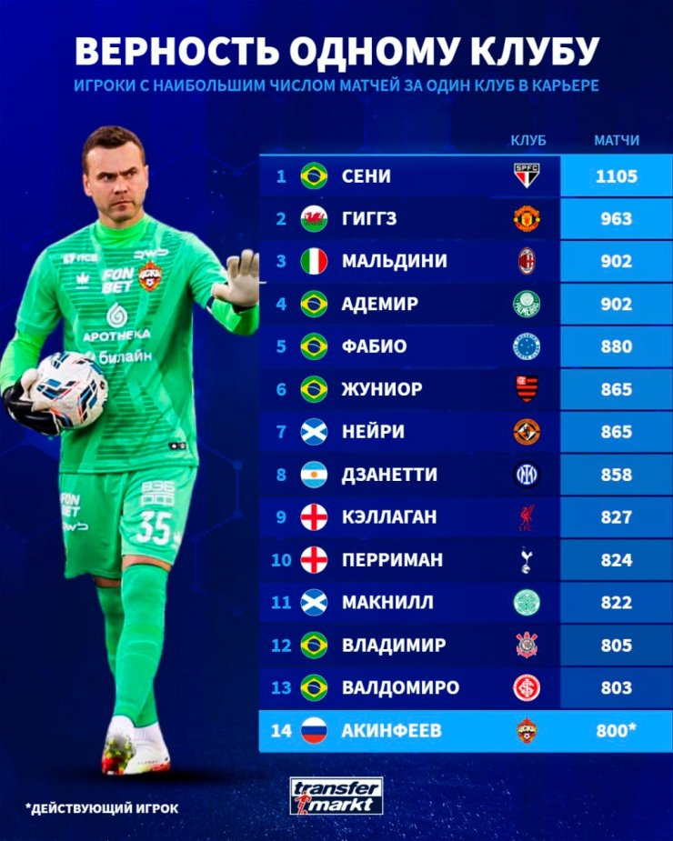 10-е место занимает английский полузащитник Стив Перриман, который с 1969-го по 1986 год сыграл 824 матча за «Тоттенхэм» во всех турнирах. Таким образом, Акинфеев может превзойти его результат и войти в топ‑10 уже в нынешнем сезоне. Рекорд всех времён принадлежит бразильскому вратарю Рожерио Сени, который провёл 1105 игр в составе «Сан‑Паулу».
