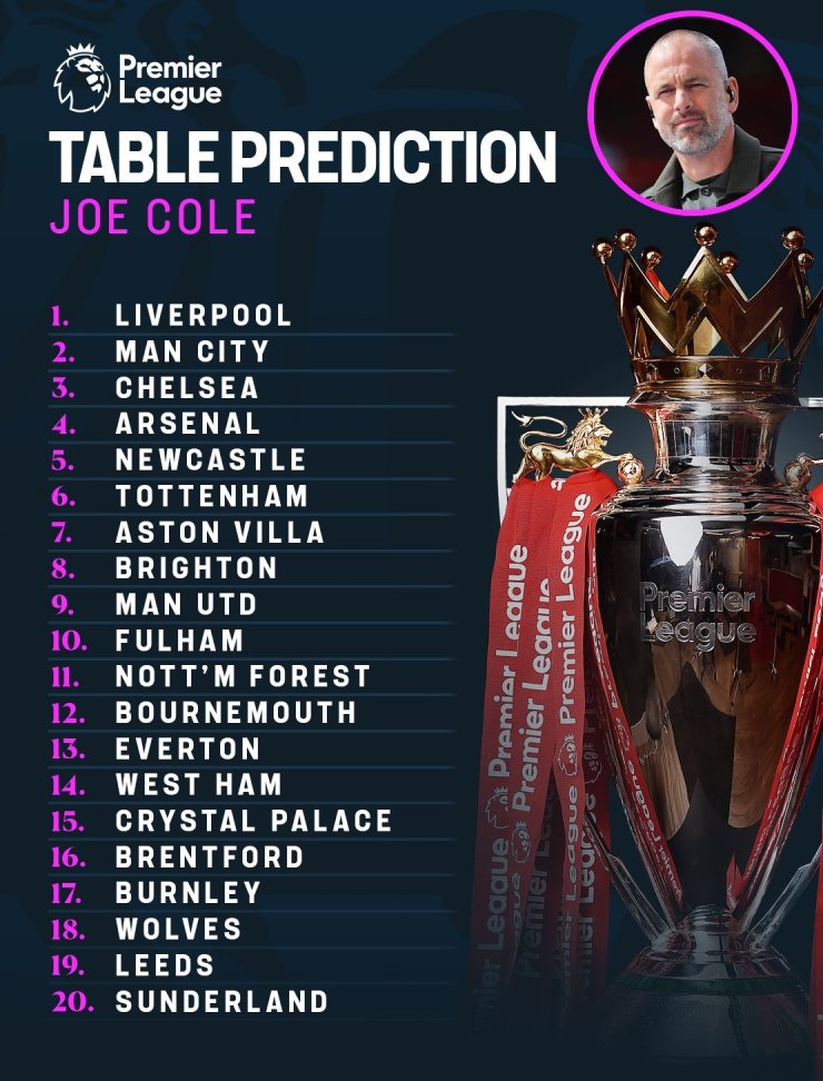 Бывший футболист сборной Англии Джо Коул сделал свой прогноз на итоговую турнирную таблицу АПЛ в новом сезоне.