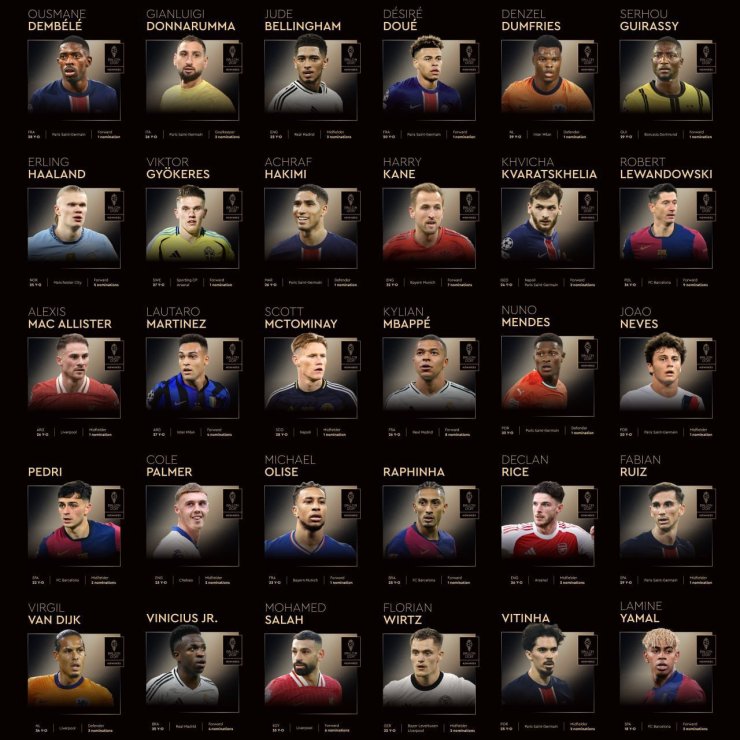 Французский журнал France Football официально опубликовал список претендентов на получение премии «Золотой мяч» в 2025 году.