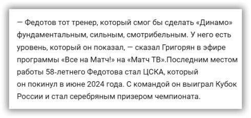 Ранее председатель совета директоров московского «Динамо» Александр Ивлев сообщил журналистам, что до конца 2025 года будет принято решение о будущем исполняющего обязанности главного тренера команды Ролана Гусева.
