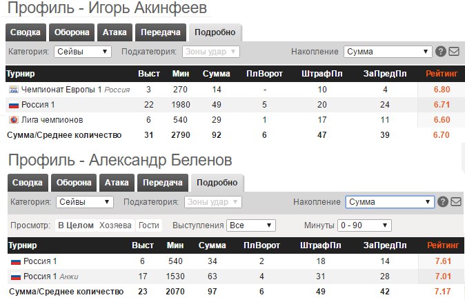красноречивей некуда. пусть и дальше орут, что игорь незаменим и лучший в нашей стране. у игоря нет ни одного матча в сезоне с оценкой 8 и выше. у беленова таких 3, причем есть даже оценка 9.33!! (против терека). а игорь, сыграв на 8 матчей больше, сделал на 5 сейвов меньше! и это с защитой, которая куда сильнее обороны анжи и уфы.